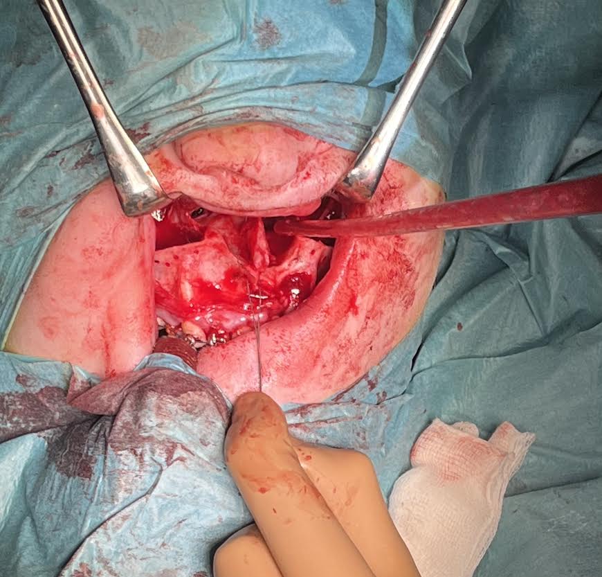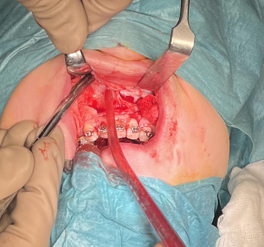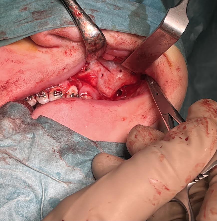 Po finalizovaní osteotómie v celom rozsahu sa pristupuje k “Down Fracture“ maxily (zlomenina vytvorená digitálnym tlakom na frontálny úsek processus alveolaris maxillae s jeho následnou mobilizáciou).
