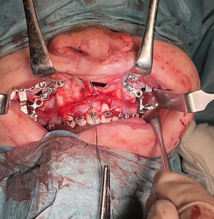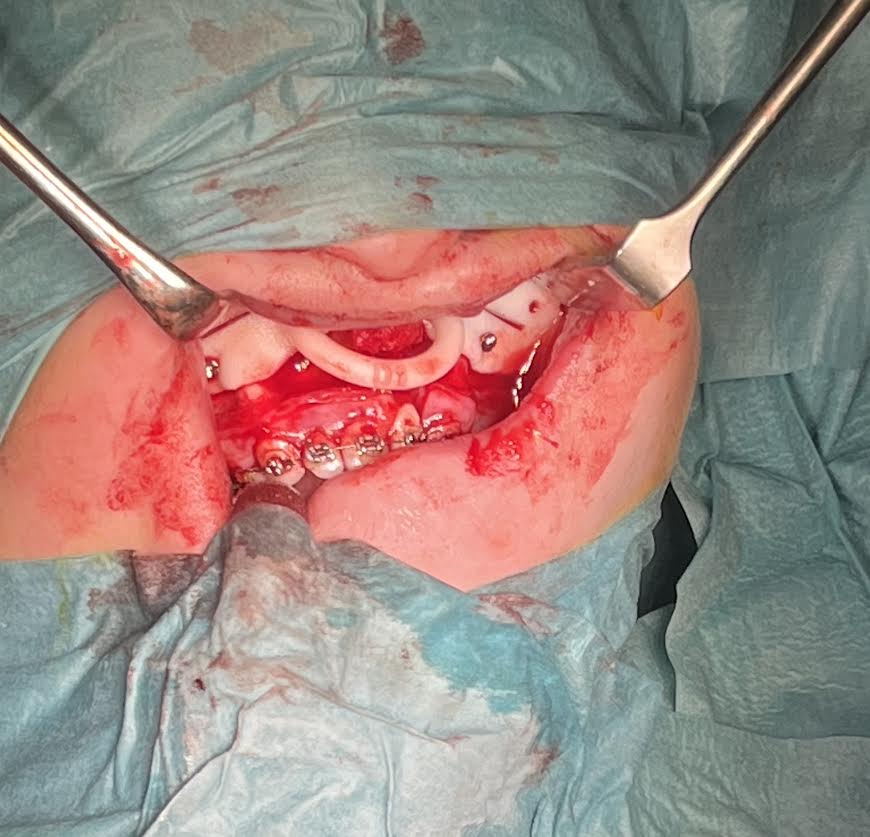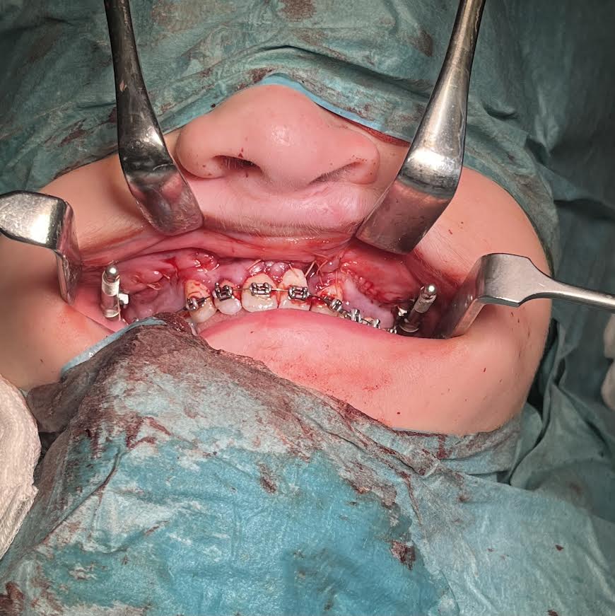 Po predoperačnej príprave u čeľustného ortopéda a virtuálnom 3D naplánovaní výkonu boli pacientovi dňa 1.4.2025 implantované osteodistraktory pri súčasnom vykonaní Le Fort I osteotómie maxily. Nasledujúce snímky zachytávajú výzor a oklúziu pacienta pred operáciou.